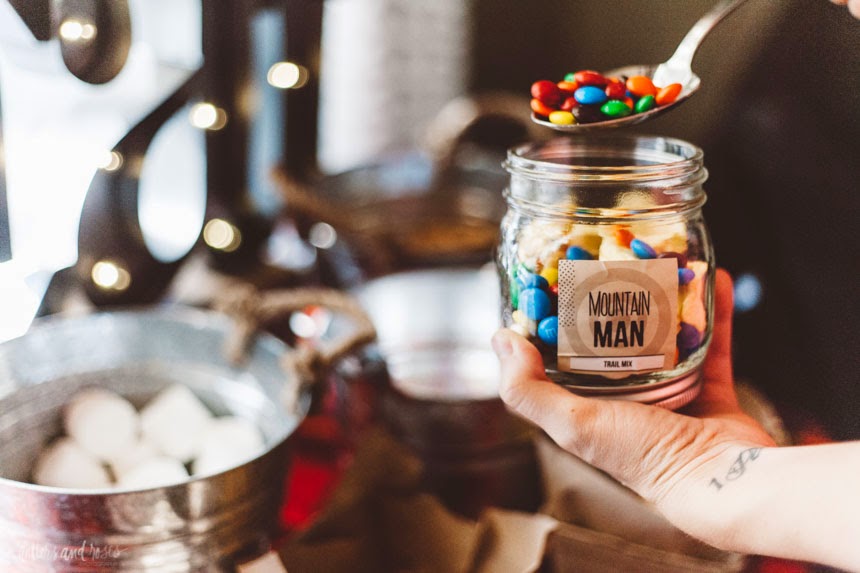 Mason jars were on display for the thank you favors. I customized gift tag stickers to go with the lumberjack theme, Mountain Man Trail Mix.